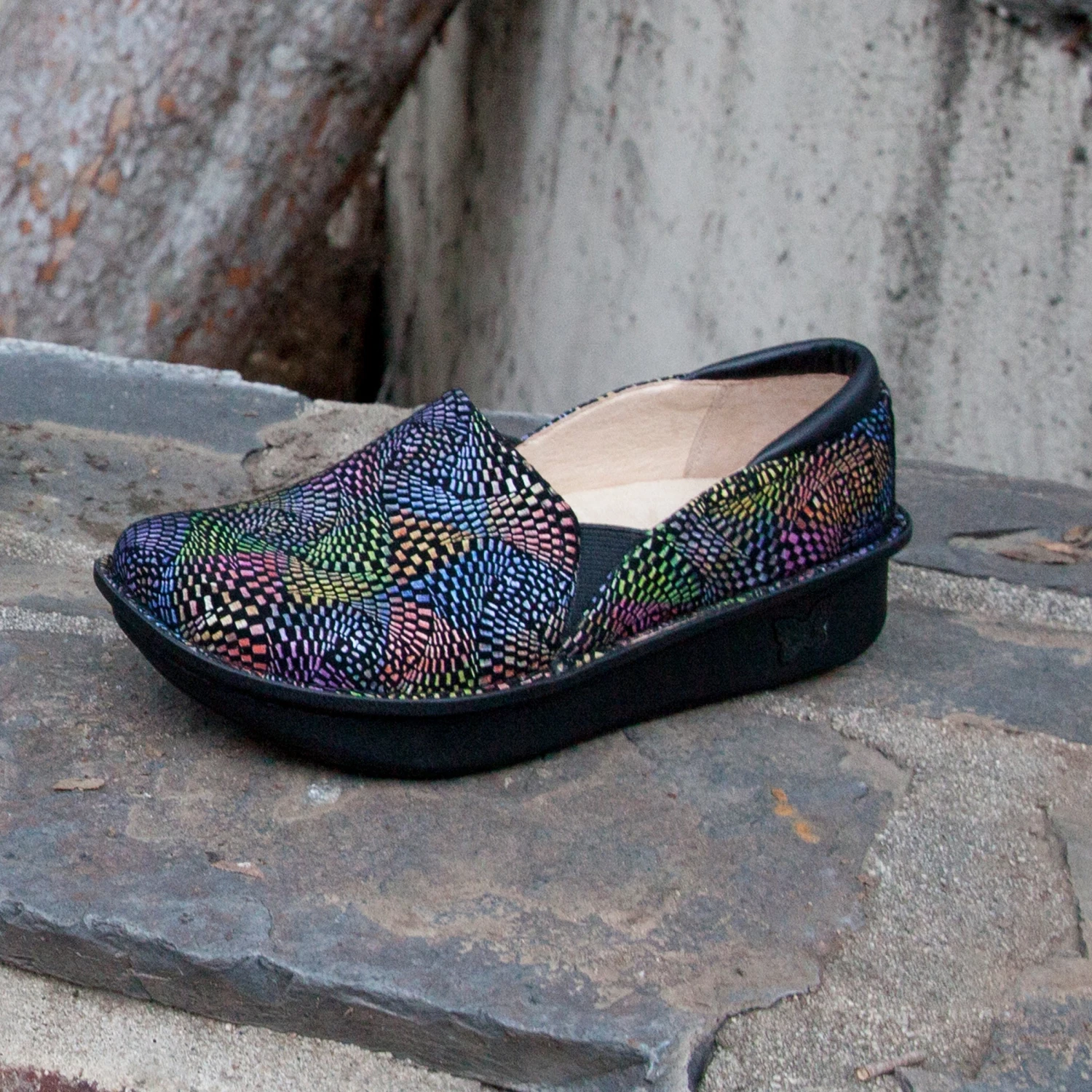 Featured in a Viewmaster design on a colorful printed suede leather upper.