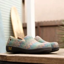 Featured here in a colorful printed Multi Composite design on a vegan leather upper.