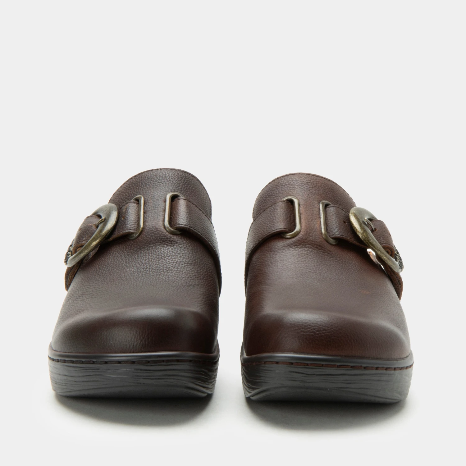 Step into effortless style and unbeatable comfort with a trendy backless slip-on leather clog. The stylish buckle ornament adds a touch of sophistication, elevating this classic design with a modern edge. Featuring a comfortable wood look rocker sole, these clogs provide the perfect combination of height, support, and all-day comfort. The convenient backless design makes them easy to slip on and off, perfect for busy days or casual outings.Â
