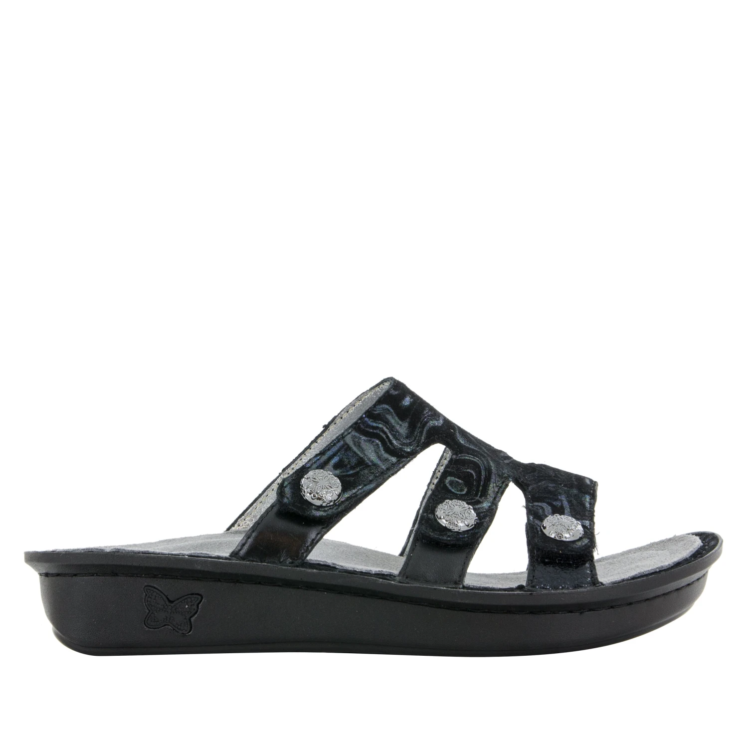 This slide on sandal sure stands out from the crowd with it’s gleaming leather upper and flashy buckle ornaments.